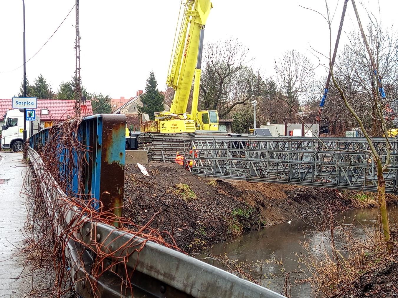 Prace przy budowie mostu tymczasowego w Sośnicy nabierają tempa i postępują bez względu na warunki pogodowe. Dziś w miejscu przyszłej przeprawy złożono konstrukcję pod obiekt tymczasowy. Już w przyszłym miesiącu zostanie on udostępniony kierowcom, pasażerom komunikacji miejskiej oraz pieszym.